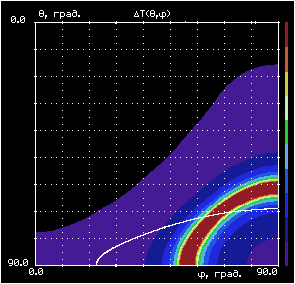 For KTP crystal (SFF type of interaction) the loci of temperature noncritical directions can be presented as the following graph (pattern). Point of intersection with phase-matching direction (white curve) shows the temperature non-critical SHG phase matching.
