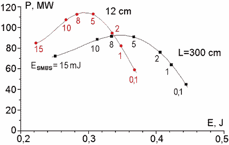 от порога ВРМБ-зеркала при двух длинах усилителя - 3 м (черная кривая) и 0,12 м (красная кривая) (суммарные расстояния между элементами). При оптимизации на максимальную выходную мощность (энергия 0,29 Дж, мощность 118 МВт, длительность 1,8 нс) удается получить выигрыш по пиковой мощности в 3 раза по сравнению со случаем оптимизации на максимальную выходную энергию (энергия 0,44 Дж, мощность 40 МВт, длительность 9,3 нс). Длительность импульса задающего генератора была 9,7 нс.