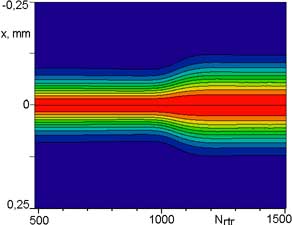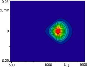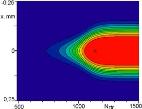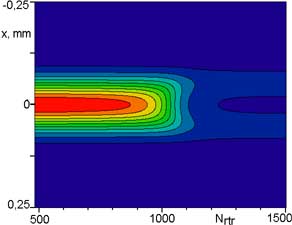 | Зависимость расперделения нормированного на максимальную величину на каждом проходе распределния плотности мощности от номера обхода по резонатору. Этот результат показывает изменение диаметра